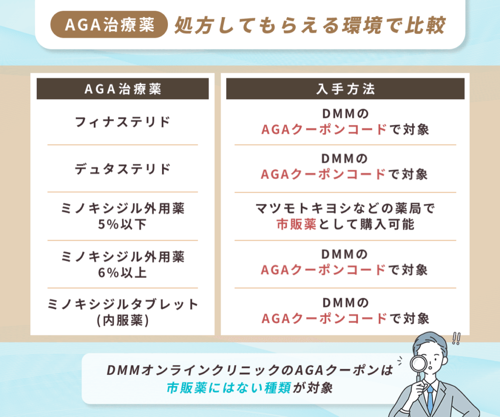 AGA治療薬には市販薬(ミノキシジル外用薬5%以下)と処方薬の2種類に分類されていますが、DMMオンラインクリニックではマツモトキヨシなどの薬局で購入できない処方薬がAGAクーポンの対象です。