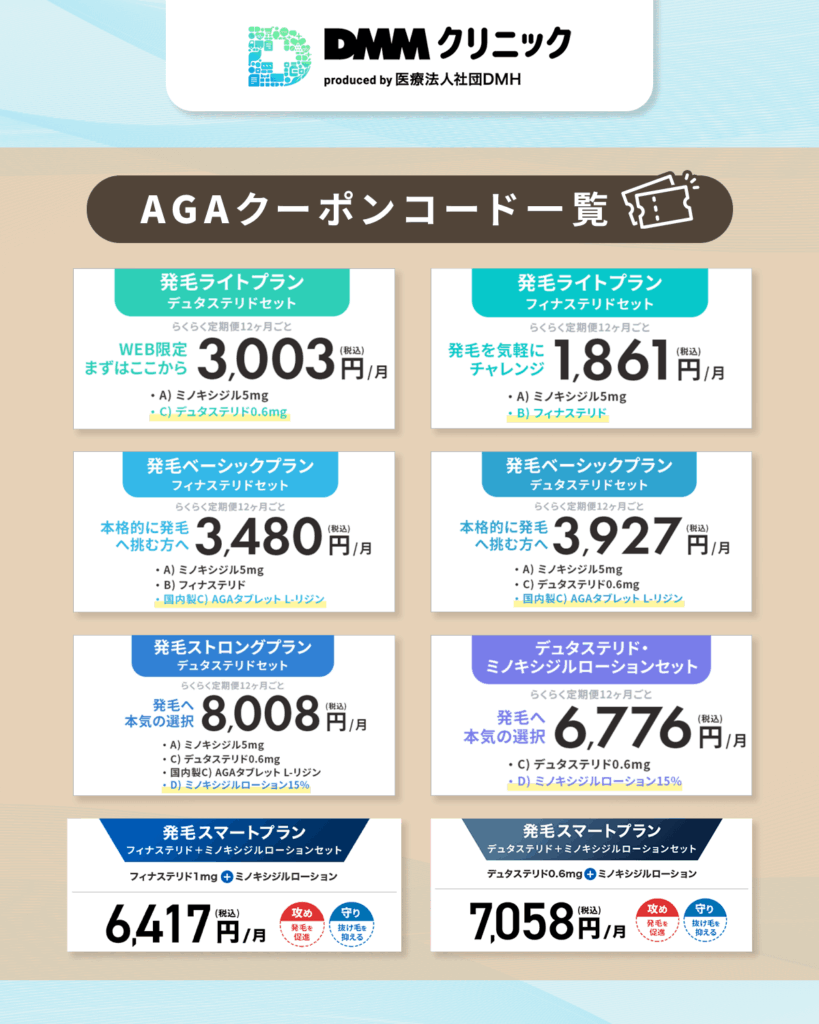 DMMの最新AGAクーポンコードと薄毛治療料金プラン一覧【2月時点】